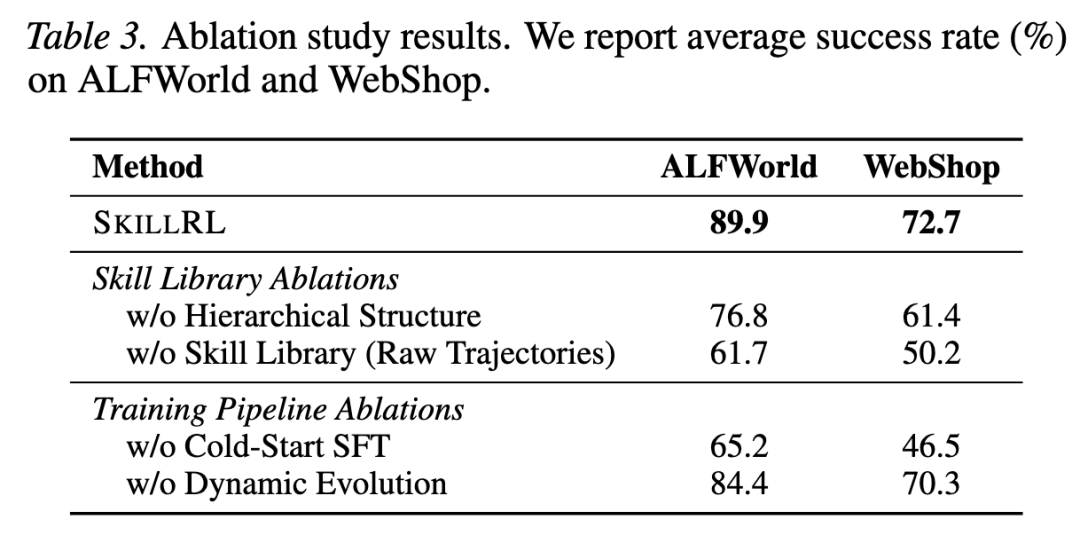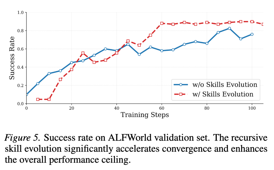 - • 有技能进化的 SKILLRL 在约 60 步内达到 80% 以上成功率,而无进化的版本需要约 90 步才能达到一个更低的峰值。