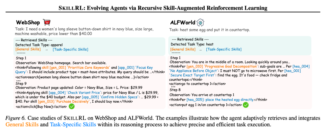 - • 任务特定技能(Task-Specific Skills):编码特定任务类型的专业知识。例如加热任务中的“先拿到物品再去微波炉”、购物任务中的“选择变体后重新确认价格”。
